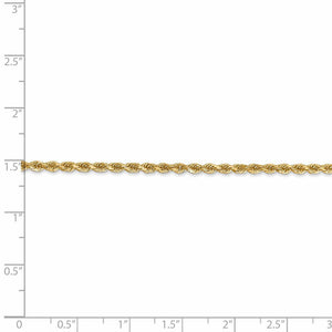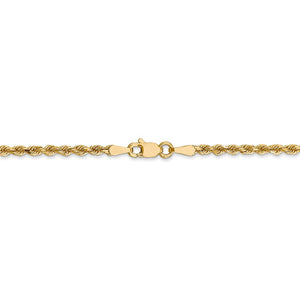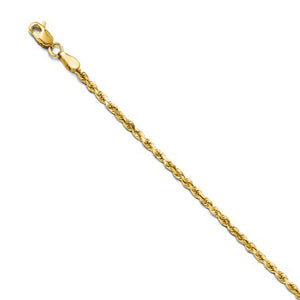 Spiraling rope chains made of 14k yellow gold enhanced with diamond-cuts are extremely popular because they offer a classic design with maximum shine. Flexible and strong, this solid link lightweight necklace chain measures 2.5mm in width by 24-inches in length and closes with a classic lobster-claw clasp.