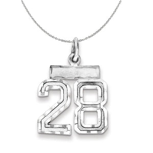 Celebrate your favorite sports player, lucky number or milestone date in your life with a prominent rhodium-plated sterling silver charm. Each satin and diamond cut number is approximately 12mm (7/16 Inch) in length, which is finished with a 3mm top bar and classic jump ring that will accommodate up to a 3mm chain. Includes a 1.25mm, 24 inch sterling silver cable chain.