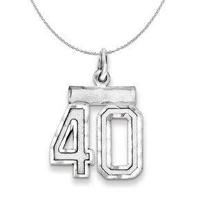 Celebrate your favorite sports player, lucky number or milestone date in your life with a prominent rhodium-plated sterling silver charm. Each satin and diamond cut number is approximately 12mm (7/16 Inch) in length, which is finished with a 3mm top bar and classic jump ring that will accommodate up to a 3mm chain. Includes a 1.25mm, 20 inch sterling silver cable chain.