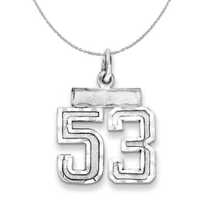Celebrate your favorite sports player, lucky number or milestone date in your life with a prominent rhodium-plated sterling silver charm. Each satin and diamond cut number is approximately 12mm (7/16 Inch) in length, which is finished with a 3mm top bar and classic jump ring that will accommodate up to a 3mm chain. Includes a 1.25mm, 20 inch sterling silver cable chain.