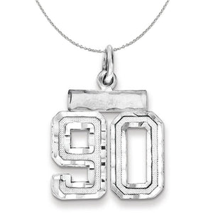 Celebrate your favorite sports player, lucky number or milestone date in your life with a prominent rhodium-plated sterling silver charm. Each satin and diamond cut number is approximately 12mm (7/16 Inch) in length, which is finished with a 3mm top bar and classic jump ring that will accommodate up to a 3mm chain. Includes a 1.25mm, 20 inch sterling silver cable chain.