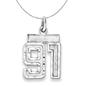 Celebrate your favorite sports player, lucky number or milestone date in your life with a prominent rhodium-plated sterling silver charm. Each satin and diamond cut number is approximately 12mm (7/16 Inch) in length, which is finished with a 3mm top bar and classic jump ring that will accommodate up to a 3mm chain. Includes a 1.25mm, 20 inch sterling silver cable chain.
