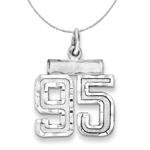 Celebrate your favorite sports player, lucky number or milestone date in your life with a prominent rhodium-plated sterling silver charm. Each satin and diamond cut number is approximately 12mm (7/16 Inch) in length, which is finished with a 3mm top bar and classic jump ring that will accommodate up to a 3mm chain. Includes a 1.25mm, 24 inch sterling silver cable chain.
