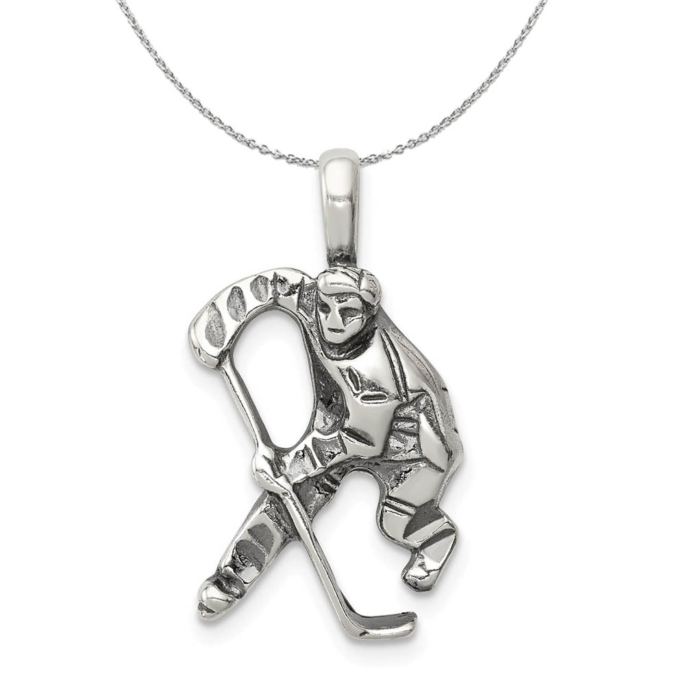 Start conversations wherever you go with a unique charm created to spark interest and reveal your passion for hockey. This antiqued sterling silver pendant features a two-dimensional open back design that is approximately 15mm (9/16 inch) in width by 25mm (1 Inch) in length, which includes the tapered bail. Includes a 1.25mm, 18 inch sterling silver cable chain.