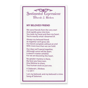 A double heart design fashioned from rhodium plated sterling silver and white cubic zirconia stones. The pendant measures 3/4 inches x 1 inch and swings on a matching 18 inch cable chain finished with a spring ring clasp. Each necklace includes a card with the following artist poem printed in English and Spanish. MY BELOVED FRIEND - We were friends from the very start and rapidly grew into love. You took my hand and then my heart. You're exactly what I dreamed of. Always my beloved friend as together we'll grow old. Our bond complete without an end with more love than we can hold. Our days we'll spend together, although some will be apart. It doesn't matter whether for we are bound by the heart. No greater mystery is there, my love you have won. One lifetime to share, two human souls as just one.