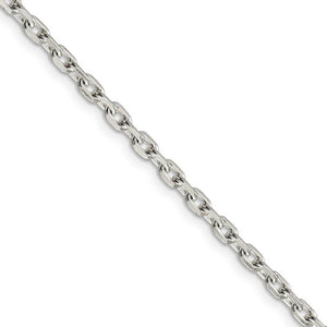 Cable chains are the most common type of jewelry chain that is made using an individual oval or round link interlocked in a uniform pattern, with each link lying at ninety degrees to the next. It is identical throughout, giving it a simple but classic look. This polished sterling silver necklace features solid open oval links that are beveled on the edge and approximately 3.25mm in width by 36-inches in length. It closes with a lobster claw clasp.