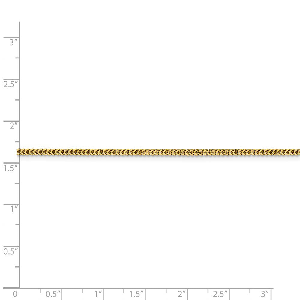 Franco chains feature an interwoven V-shaped solid link design that is tightly joined together creating a braided effect and is sturdy enough for daily wear. This polished 14k yellow gold bracelet is approximately 1.4mm in width by 7-inches in length and closes with a lobster clasp.