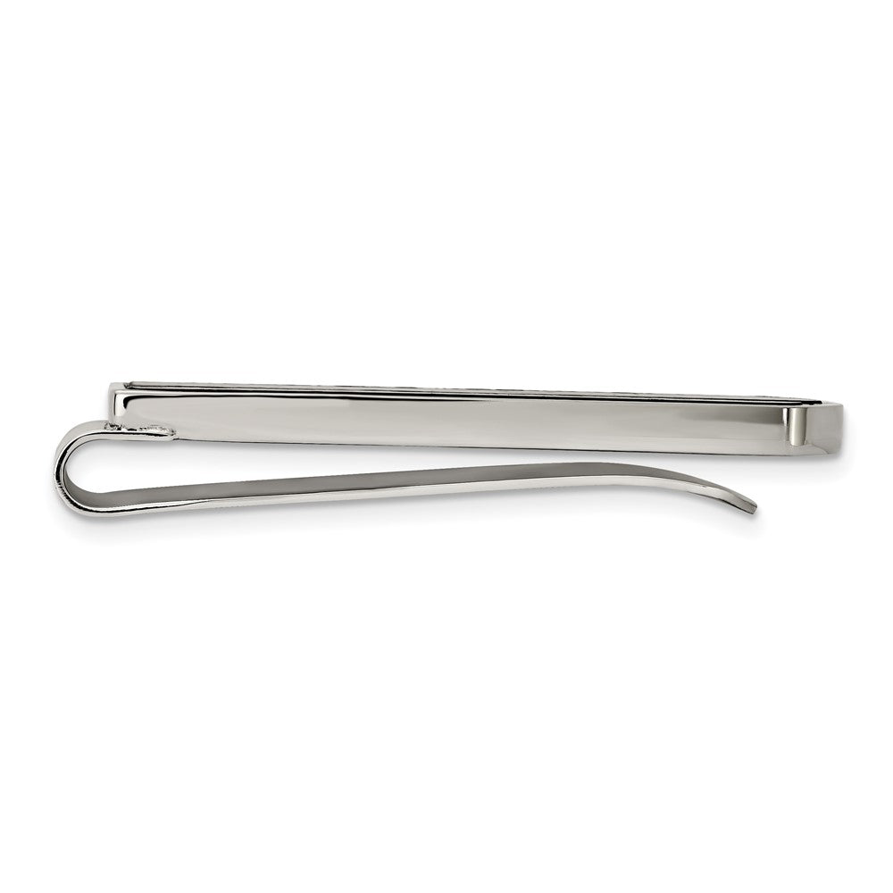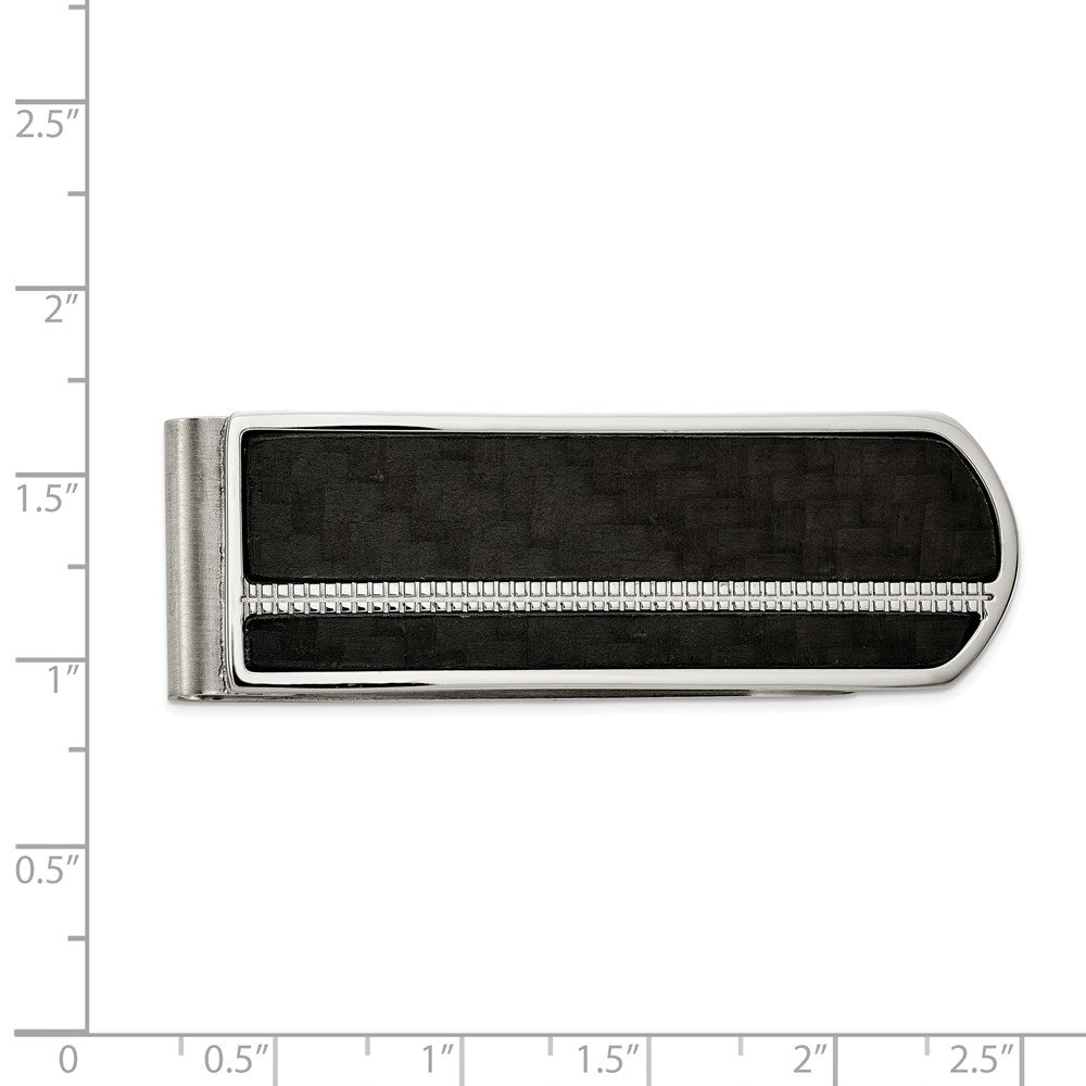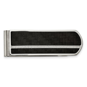 Carry your money in style with this stainless steel money clip featuring a black carbon fiber inlay design, a brushed and polished finish, and a slim fold-over style. It is approximately 18mm (11/16 inch) in width by 55mm (2 1/4 inch) in length. Suitable for engraving on the back.