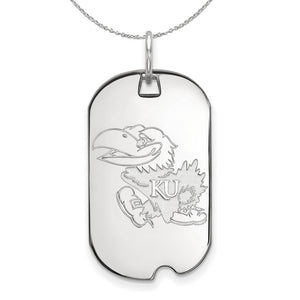 If you are a fan of The University of Kansas and the Jayhawks then you need to show your school spirit with this University of Kansas necklace. We are a certified college jewelry retailer and this authentic item is officially licensed. It is crafted from Sterling Silver and crafted by LogoArt in the USA. It is approximately 18mm (11/16 inch) in width by 30mm (1 3/16 inch) in length. The total length with the jump ring or bail is 36mm (1 3/8 inch). Includes a 20 Inch, 1.25mm sterling silver franco chain.