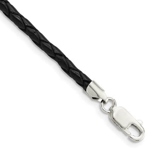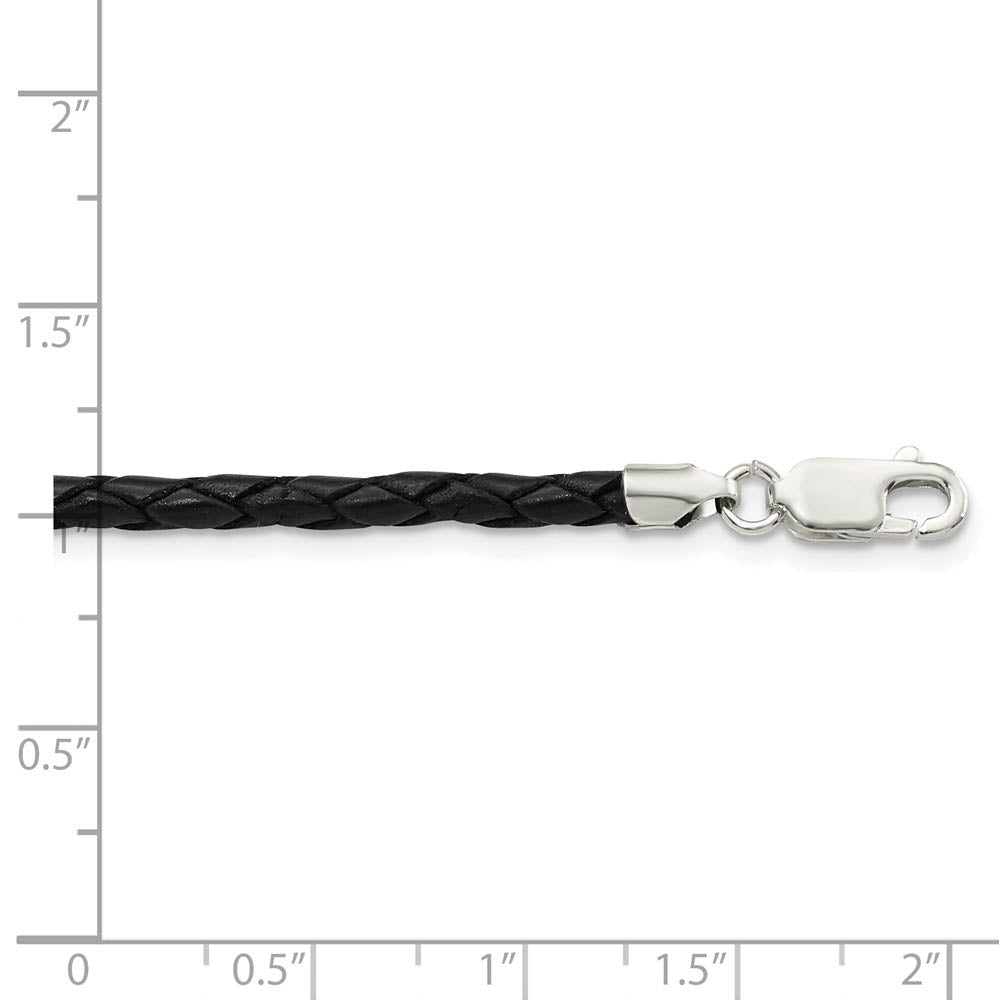 This 3mm width, braided, black leather cord necklace is 20 inches in length and finished with a sterling silver lobster clasp.