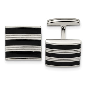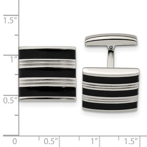 Classic elegance, perfect for every occasion! These polished stainless-steel cuff links feature a black rubber and grooved striped design with a whale back toggle clasp. They are approximately 18mm (11/16 inch) in width by 17mm (5/8 inch) in length. Not suitable for engraving.