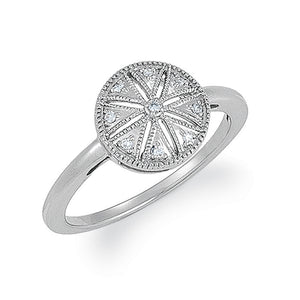 This vintage-inspired sterling silver design has an old fashioned elegance that never goes out of style. The 11mm cut out circle centered on a 2mm slightly tapered band features milgrain detailing and nine sparkling white diamonds. Each natural diamond is I2 in clarity, G-H in color and the total diamond weight is .4 of a carat. This is a made to order item and is estimated to ship in about 6-8 days. Please email service@theblackbow.com for more details.