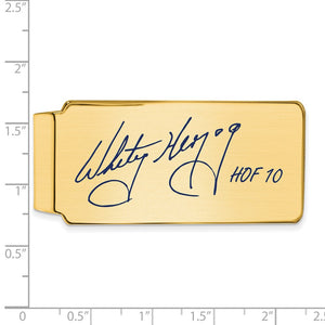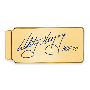 It is time to celebrate your favorite Hall of Fame baseball player, Whitey Herzog! We are a certified retailer and this authentic signature money clip is officially licensed. It features a fold over design with a brushed finish that is created from 14k yellow gold plated sterling silver with navy blue epoxy. Epoxy colors may vary slightly. The color on your screen may also not reflect actual color due to variations in monitors and browsers. The approximate size is 24mm (15/16 inch) in width by 53mm (2 inches) in length. Made in the U.S.A. This item is not currently in-stock. Once you place your order, please allow us 5 to 7 business days to make it for you.