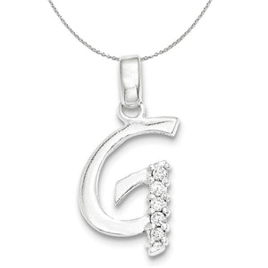 Adding a touch of glamour to your favorite initial is five prong-set clear cubic zirconia gemstones. This gleaming pendant is fashioned from sterling silver and will fit up to a 4mm width classic style chain. Each letter G is approximate 14mm (9/16 inch) in width by 24mm (15/16 inch) in length, which includes the bail. Includes a 1.25mm, 18 inch sterling silver cable chain.