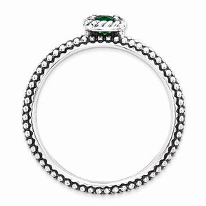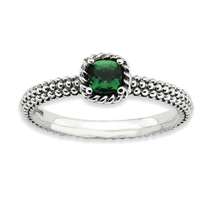 Featured atop a 2.5mm antiqued sterling silver band finished with milgrain detailing is a 4mm checkerboard cut created emerald prong set in a 6mm square rope mounting. Wear it alone or featured in a collection. Guaranteed to fit together perfectly with all of the mix and match Stackable Expressions rings. This item is backordered. Please allow 7-10 business days for delivery