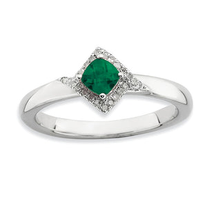 Round I3 clarity diamonds highlight a brilliant square-cut created emerald in this sparkling gemstone design that is set atop a 2.5mm gleaming rhodium plated sterling silver band. Wear it alone or featured in a meaningful collection. Guaranteed to fit together perfectly with all of the mix and match Stackable Expressions rings. Total diamond weight is 1/10 carat. This item is backordered. Please allow 7-10 business days for delivery