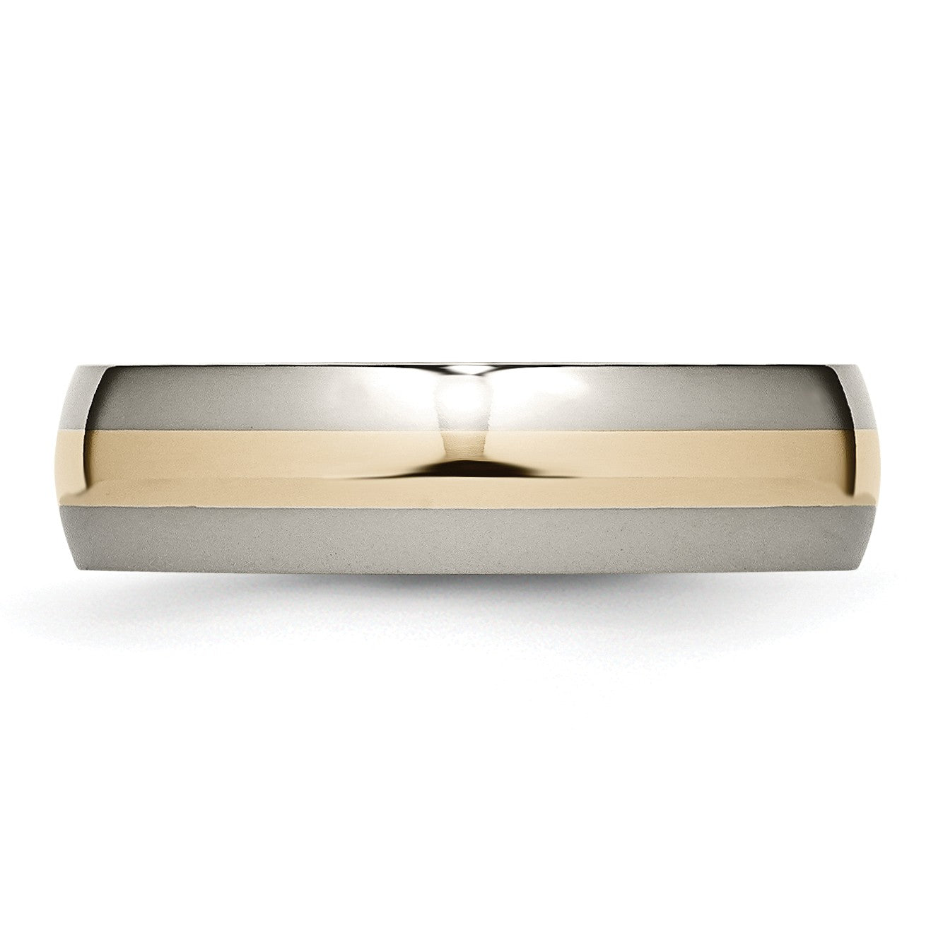 • A simple, curving band of titanium accented with a single, 14k yellow gold inlay stripe compliments any outfit. This stunning, unisex ring measures 6mm wide and features a brilliant, polished finish with a comfort fit design. Because it is also hypoallergenic, it is perfect for everyday wear. Available in whole and half sizes 6-13.