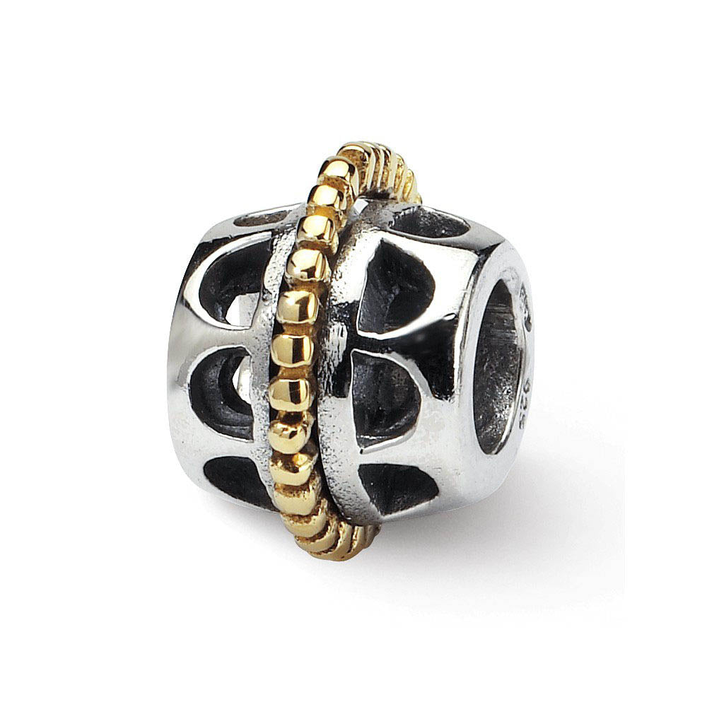 When you mix and match different textures, shapes and color combinations you will bring to life a unique piece of jewelry. This two-tone charm created from antiqued sterling silver accented with a polished 14K yellow gold beaded ring around the center is approximately 7 x 11mm with a 4mm core. It is also interchangeable as well as compatible with Reflections and other popular 3mm width bead style bracelets and necklaces.