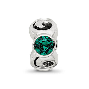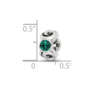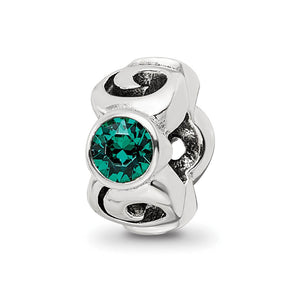 Tell your family story with this simulated birthstone charm to make it personal and unique. Green is the traditional birthstone color for the month of May. Three crystals alternate between spiraling sterling silver designs on this stunning charm that measures approximately 11 x 5.5mm and features a 4mm center. It is also interchangeable as well as compatible with Reflections and other popular 3mm width bead style bracelets and necklaces.