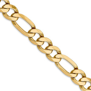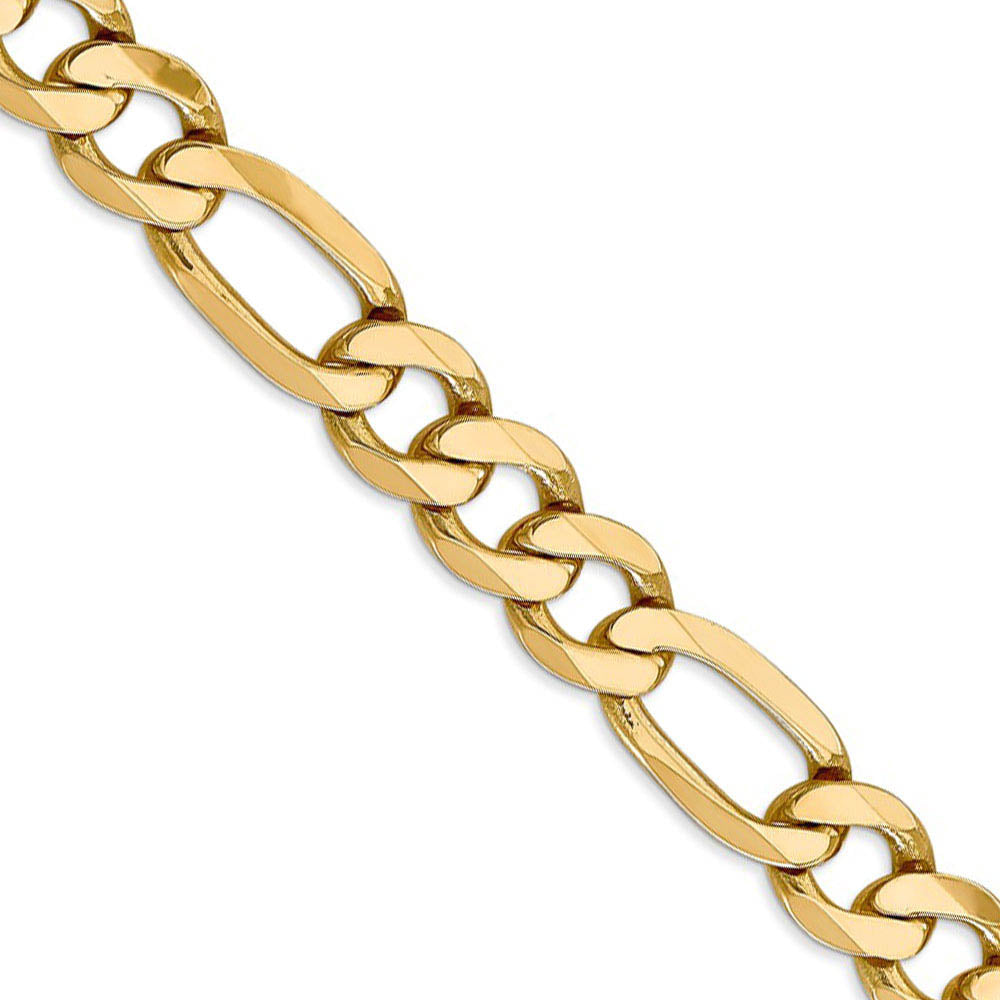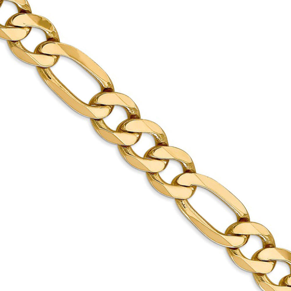 A set of three round links separated by one long oval link creates a sensational repeating pattern on this solid link, flat style figaro design. Measuring 10mm in width, this polished 14k yellow gold chain is finished with a classic lobster claw clasp. 22 inches in length.