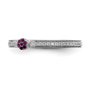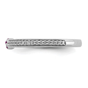 Make it simple and stylish with bands of different textures, finishes, widths and colors or extravagant with diamonds and gemstones! This stackable ring created from rhodium-plated 14k white gold features 7 genuine rhodolite garnet gemstones totaling 1/10 of a carat and 24 genuine diamonds totaling 1/8 carat. The natural diamonds are I2 in clarity and I-J in color. The color range varies on all genuine gemstones so please allow for slight variations in shades (medium to dark reddish purple). The color on your screen may also not reflect actual gemstone color due to variations in monitors. The approximate band width is 2mm and the top head width is 3mm. Guaranteed to fit together perfectly with all of the mix and match Stackable Expressions rings.