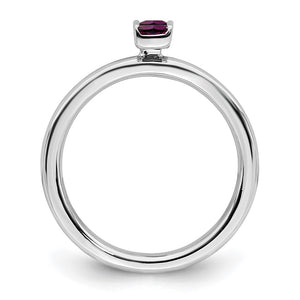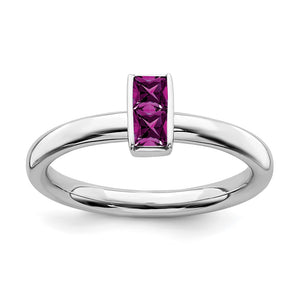 Make it simple and stylish with bands of different textures, finishes, widths and colors or extravagant with diamonds and gemstones! This stackable ring created from rhodium-plated .25 sterling silver features 2 princess-cut genuine rhodolite garnets totaling 1/2 carat. The approximate band width is 2. Mm and the ring top is approximate 4 x 6.5mm. The color range varies on all genuine gemstones so please allow for slight variations in shades (medium to dark reddish purple). The color on your screen may also not reflect actual gemstone color due to variations in monitors. Guaranteed to fit together perfectly with all of the mix and match Stackable Expressions rings.