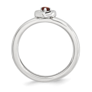 Create a look that is all your own with a fun assortment of rings that looks great alone or stacked in a collection to express your own unique style. This classic style ring fashioned from tarnish resistant rhodium plated sterling silver features a 6mm open-heart prong set with a genuine garnet and a 2.5mm width polished band. The natural untreated garnet is 2. Mm in size and the stone weight is .9 of a carat. Color range varies on all natural stones so please allow for slight variations in shades. Guaranteed to fit together perfectly with all of the mix and match Stackable Expressions rings.