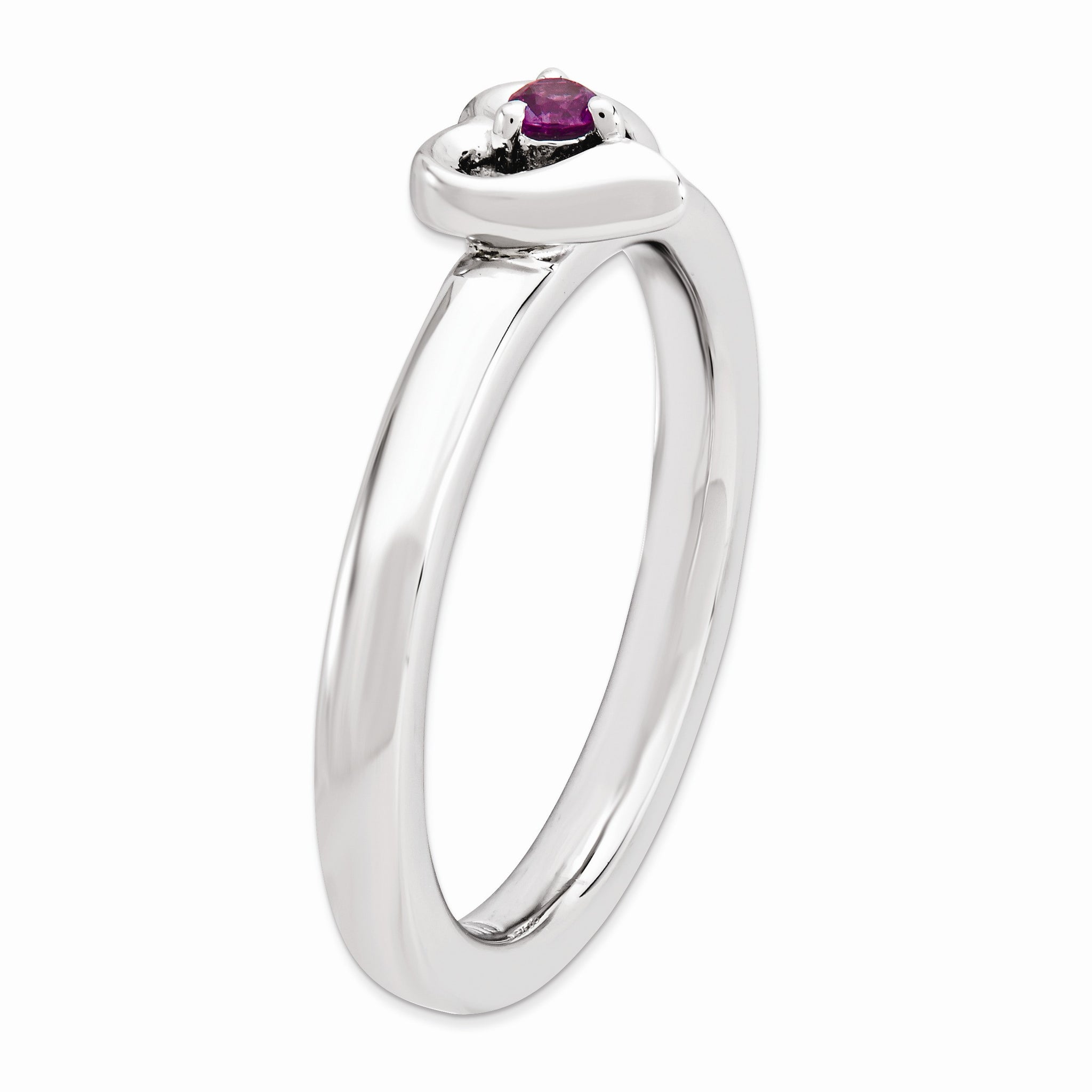 Create a look that is all your own with a fun assortment of rings that looks great alone or stacked in a collection to express your own unique style. This classic style ring fashioned from tarnish resistant rhodium plated sterling silver features a 6mm open-heart prong set with a genuine rhodolite garnet and a 2.5mm width polished band. The natural untreated garnet is 2. Mm in size and the stone weight is .9 of a carat. Color range varies on all natural stones so please allow for slight variations in shades. Guaranteed to fit together perfectly with all of the mix and match Stackable Expressions rings.