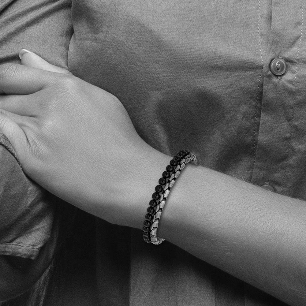 Change up your look with this men's white-bronze-plated stainless steel and gemstone bracelet featuring an antiqued and brushed box chain and polished black agate beads. It is approximately 12mm (7/16 inch) in width, closes with a magnetic clasp and is adjustable in length from 8 to 8.5 inches with the removable 1/2 inch extender link.