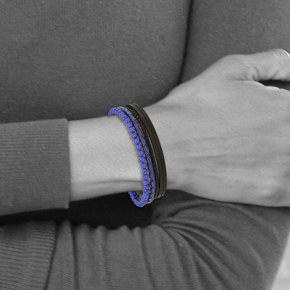 Change up your look with this unisex black-plated stainless steel, genuine leather and gemstone bracelet featuring black and blue leather cords and polished blue lapis beads. It is approximately 18mm (11/16 inch) in width, closes with a polished magnetic clasp and is adjustable in length from 7.5 to 8 inches with the removable 1/2 inch extender link. The color range varies on all natural gemstones so please allow for slight variations in shades. The color on your screen may also not reflect actual gemstone color due to variations in monitors and browsers.