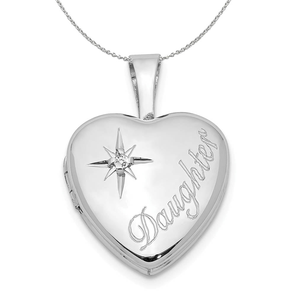 This heart-shaped locket beautifully detailed with an elegant script and a diamond accented star design is fashioned from polished sterling silver. It opens to hold two small photos and is approximately 12mm (7/16 Inch) in width by 18mm (11/16 inch) in length, which includes the tapered bail. Prong set with a single, 1.3mm diamond that is i2-I3 in clarity, I-J in color and weighs .01 carat. Includes a 1.25mm, 18 inch sterling silver cable chain.
