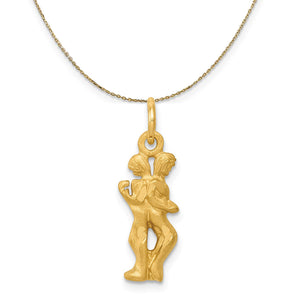 Gemini zodiac sign, the Twins. Two children full of the wonderment, curiosity and intelligence. This 14k gold charm features a satin finish with diamond-cut accents, measures approximately 7mm (1/4 Inch) in width by 17mm (5/8 Inch) in length and dangles from a classic jump ring. The pendant is . Includes a 24 inch, 0.8mm 14k yellow gold cable chain with a lobster clasp.