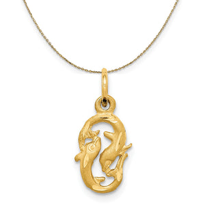 Pisces zodiac sign, the Fish. Two fish swim in opposite directions, symbolic of life after death. Their journey embraces the now as they swim toward the future. This 14k gold charm features a satin finish with diamond-cut accents, measures approximately 8mm (5/16 Inch) in width by 15mm (9/16 inch) in length and dangles from a classic jump ring. The pendant is . Includes a 20 inch, 0.8mm 14k yellow gold cable chain with a lobster clasp.