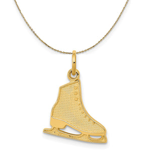 Express your freestyle spirit with this textured ice skate charm rendered in polished 14k yellow gold. It measures approximately 13mm (1/2 Inch) in width by 17mm (5/8 Inch) in length, which includes the jump ring. Includes a 16 inch long, 0.9mm wide, solid 14k yellow gold cable chain with a spring ring clasp.