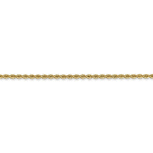 A traditional 14k yellow gold rope chain measuring 2mm in width is handmade and closes with a lobster claw clasp. Its versatile, solid link design is ideal for anklets. 10 inches in length.