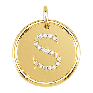 Creating the dazzling letter in the center of this eye-catching 14k gold disc pendant is 18 full cut, round white diamonds that are I1 in clarity and G-H in color. It measures 17mm in diameter and the smooth back side is suitable for engraving. Total diamond weight is .09 of a carat. Chain not included. This is a made to order item and is estimated to ship in about 6-8 days. Please email service@theblackbow.com for more details.
