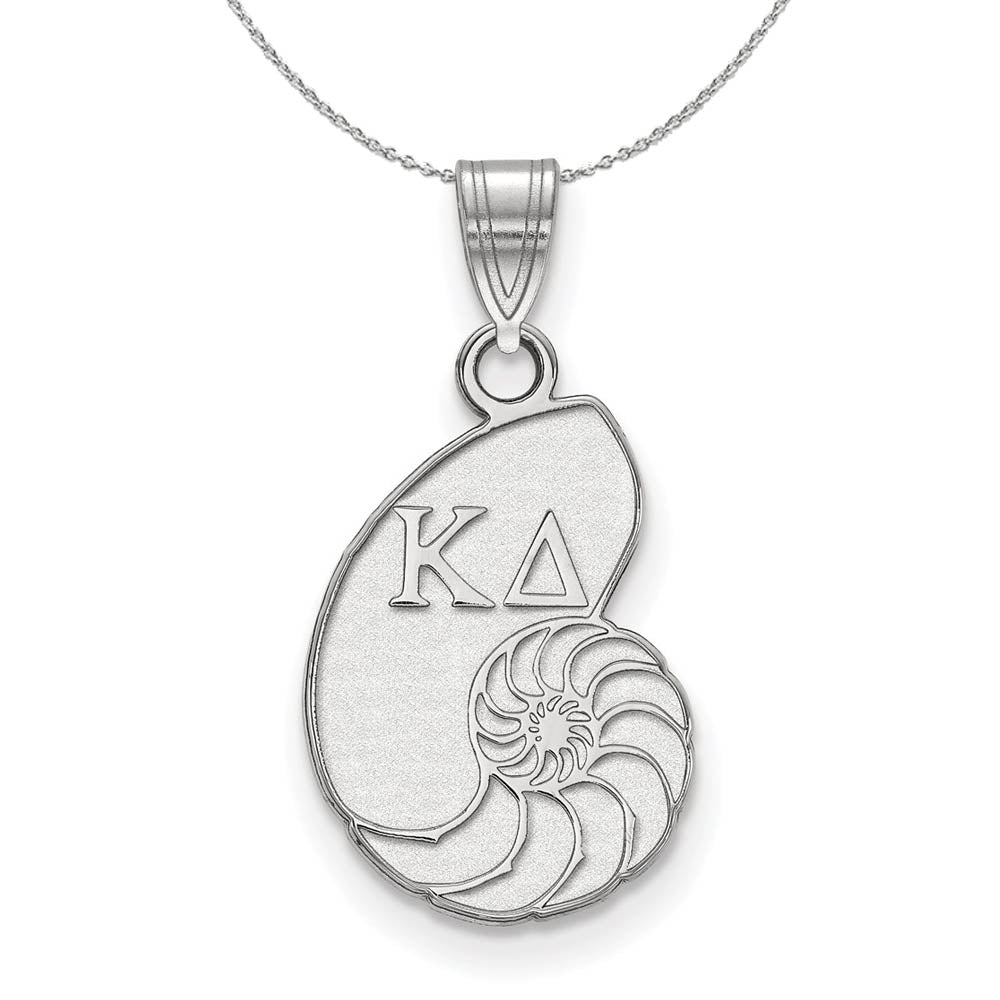 • Show your greek life spirit with this Kappa Delta Sorority pendant necklace. It is crafted with rhodium plated sterling silver and without the bail is 16mm in height and 11mm in width (0.63 in x 0.43 in). With the bail, the measurements are 21mm in height and 11mm in width. We are a certified LogoArt retailer and this authentic item is licensed by the Kappa Delta Sorority and Greek Life. This pendant necklace is made the USA. Includes a 24 Inch, 1.25mm cable chain.