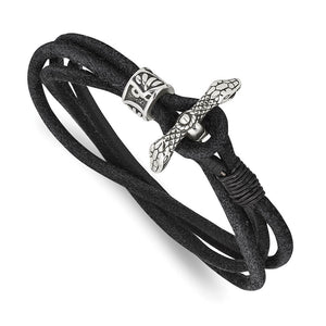 Change up your look with this 8-inch stainless steel and genuine black suede leather bracelet featuring an antiqued snake head and double-strand wrap design. The snake head toggle bar is approximately 31mm (1 1/4 inch) in width and the double strand length from end to end is approximately 16 inches but may vary slightly.