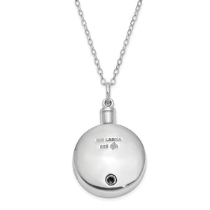Commemorate the devotion of your faithful companion with this keepsake necklace that can be filled with a lock of hair, cremated remains or any small reminder of your beloved pet. Designed from rhodium-plated sterling silver, this memorial pendant measuring 25mm (1 inch) in diameter features an antiqued embossed design on the front, a polished back with a screw opening and a 1.8mm width, 18-inch long cable chain finished with a spring ring clasp. Included with each purchase is a small funnel and a card with the following inspirational verses printed in English and Spanish. Isaiah 25:7-8, Psalm 23:4, Luke 2:29.