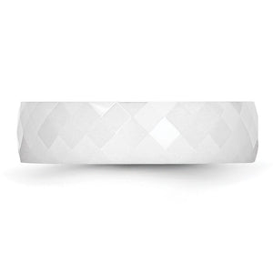 • Combining the look and feel of porcelain with the strength and durability of titanium, Ceramic is the latest in high-tech, inorganic, non-metallic material that is scratch and fade resistant. This 6mm width faceted band features a standard fit shank, a brilliant white color and because it is also hypoallergenic, it is perfect for those with sensitive skin. Suitable for laser engraving. Available in whole and half sizes 5-9.