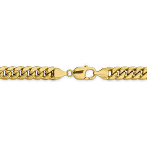 Ageless and classic, a wide Miami Cuban curb chain is eye-catching and fashionable. The 10k yellow gold hollow links on this polished bracelet chain are 9.3mm in width by 9 inches in length and close with a sturdy lobster clasp.