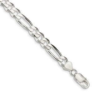Round and oval links made of polished sterling silver interlock in a reoccurring three and one pattern that closes with a lobster claw clasp. The easy elegance of a classic Figaro bracelet looks great with dress or casual wear and the 8mm width is perfect on its own or combined with other chains to create a layered style. 7-inches in length.