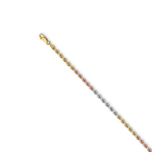 This stunning rope chain necklace handmade from 14k yellow, white and rose gold features a sparkling, diamond-cut design that is finished with a secure, lobster clasp. It measures 3mm in width by 18-inches in length and looks great alone, layered with multiple chains or paired with a gold charm or pendant to complete your desire look.