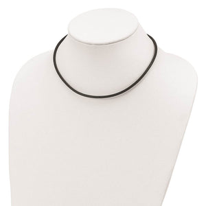 This 3mm width black leather cord necklace is 16 inches in length and finished with a tarnish-resistant, rhodium-plated sterling silver fancy lobster clasp.