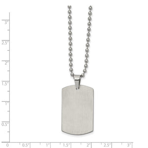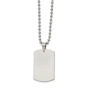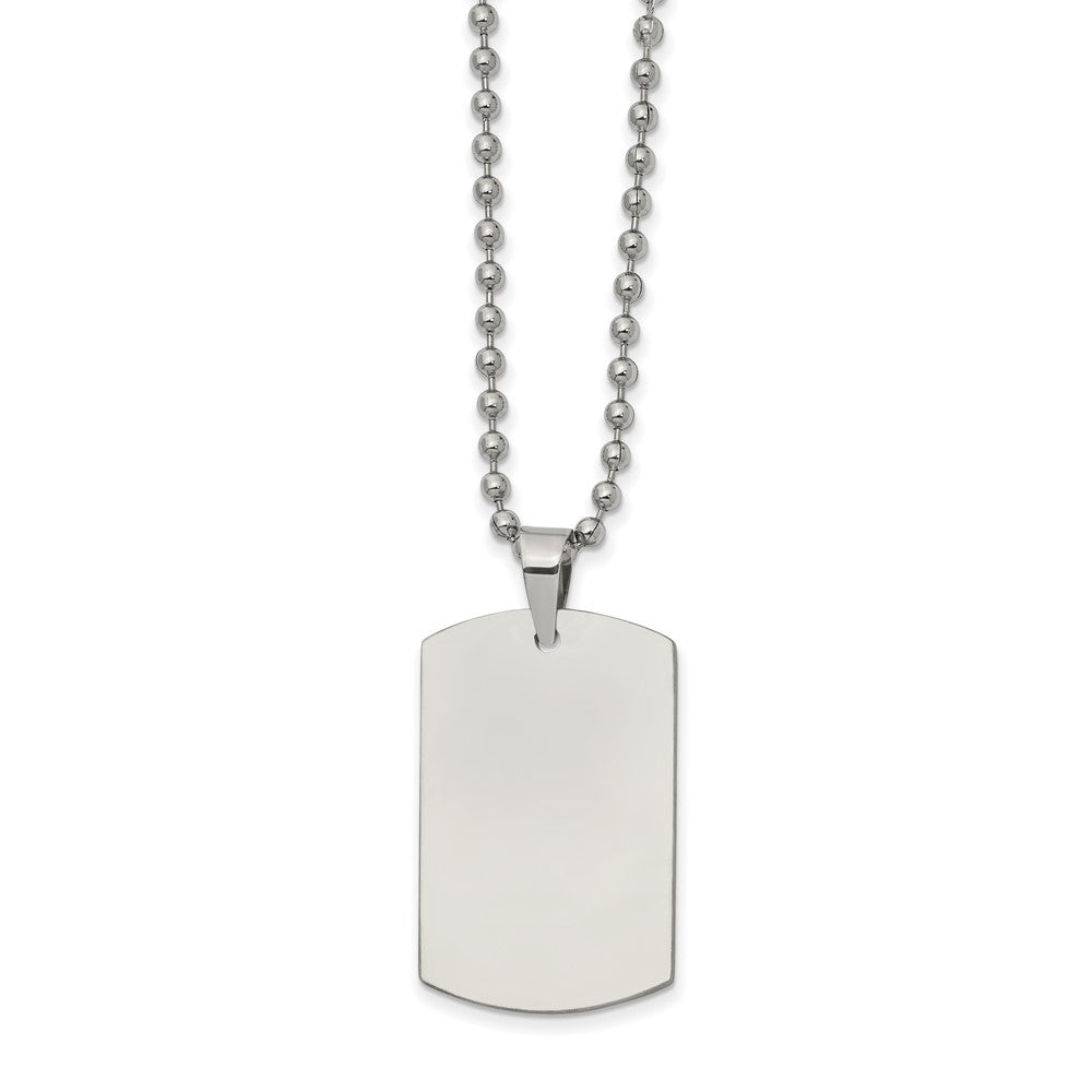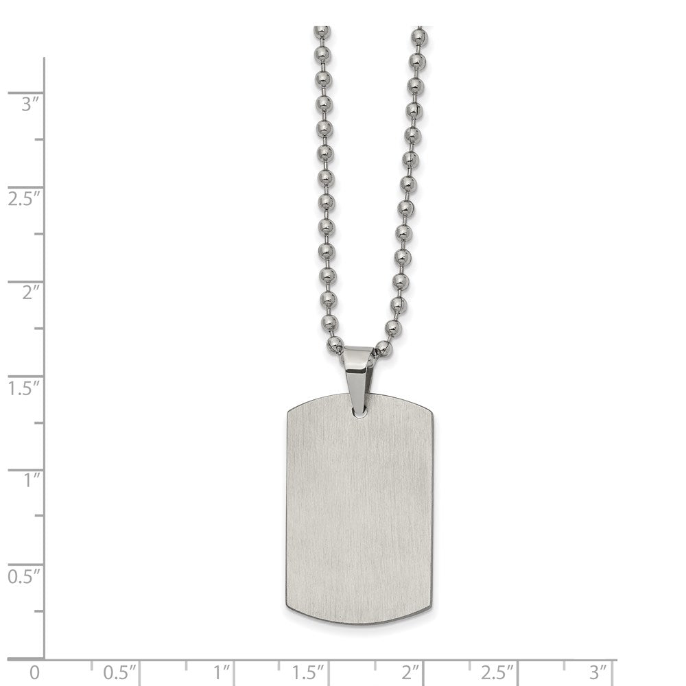 Simple and classic, this reversible stainless-steel necklace features a 20mm (3/4 inch) width by 32mm (1 1/4 inch) long dog tag pendant that is polished on 1 side, brushed on the opposite side and suitable for engraving. It includes a 2.3mm width by 22-inch-long polished bead chain that closes with a fancy lobster clasp. This item is backordered and we estimate it to ship in approx. 10-12 days. Please email service@theblackbow.com for more details.