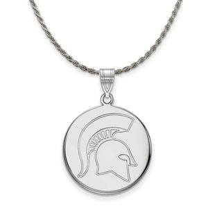 • If you are a fan of Michigan State University and the Spartans then you need to show your school spirit with this Michigan State University pendant. We are a certified college jewelry retailer and this authentic item is officially licensed. It is crafted from Sterling Silver and crafted by LogoArt in the USA. Includes a flexible and strong diamond cut rope chain. This stunning chain is 2.25mm in width, 20 inches in length and features a sturdy lobster claw clasp. The chain is crafted in Italy.