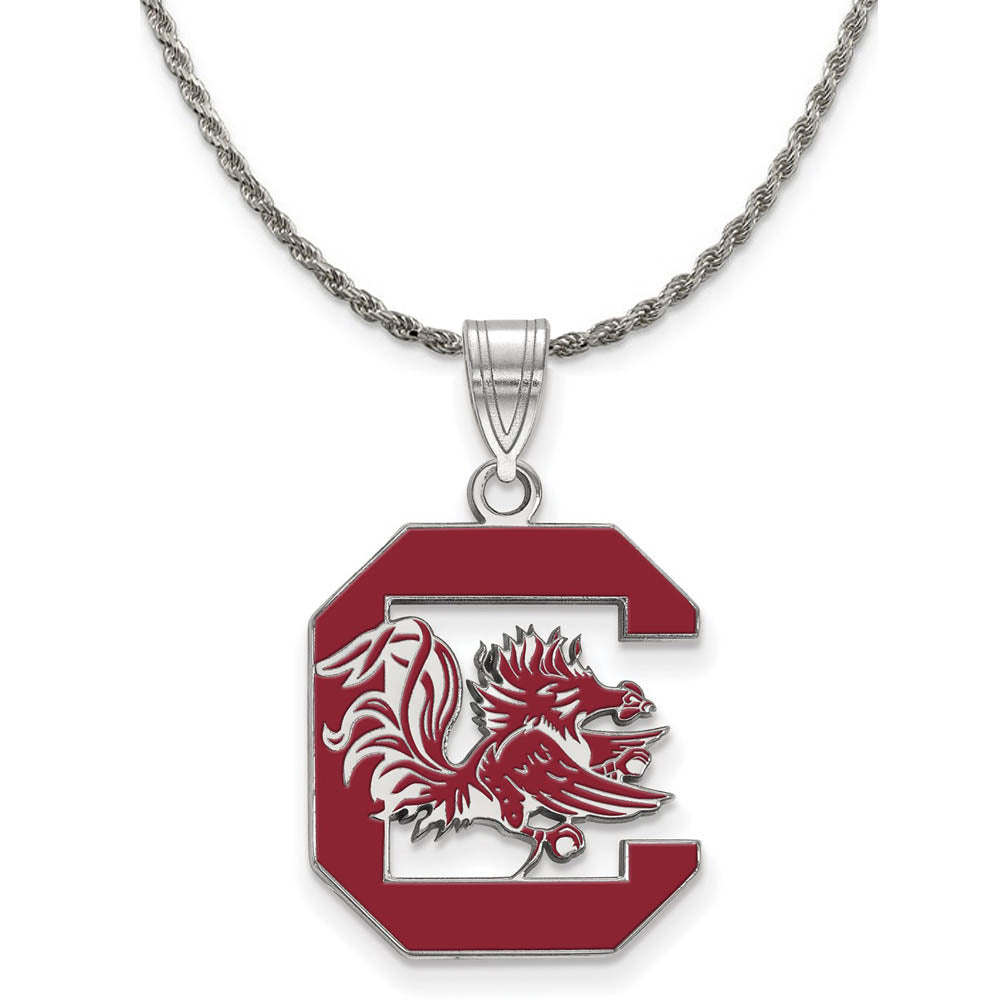 • If you are a fan of The University of South Carolina and the Fighting Gamecocks then you need to show your school spirit with this University of South Carolina pendant. We are a certified college jewelry retailer and this authentic item is officially licensed. It is crafted from Sterling Silver and crafted by LogoArt in the USA. Includes a flexible and strong diamond cut rope chain. This stunning chain is 2.25mm in width, 24 inches in length and features a sturdy lobster claw clasp. The chain is crafted in Italy.