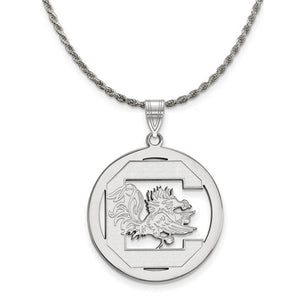 • If you are a fan of The University of South Carolina and the Fighting Gamecocks then you need to show your school spirit with this University of South Carolina pendant. We are a certified college jewelry retailer and this authentic item is officially licensed. It is crafted from Sterling Silver and crafted by LogoArt in the USA. Includes a flexible and strong diamond cut rope chain. This stunning chain is 2.25mm in width, 22 inches in length and features a sturdy lobster claw clasp. The chain is crafted in Italy.
