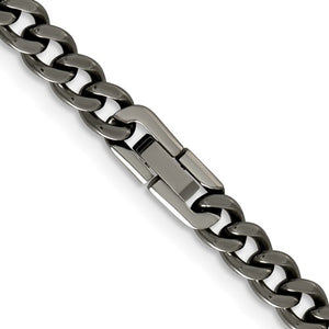 Ageless and classic, a titanium curb chain is one of the most durable styles. Titanium's beautiful dark gray color combined with its versatile properties makes it a superb choice for those who want a chain that will endure the test of time. This polished necklace is approximately 7.5mm in width by 20-inches in length including the fold-over clasp.