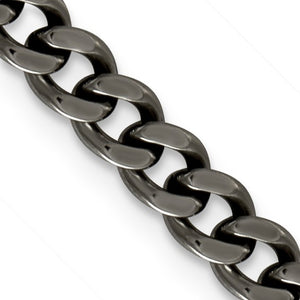 • Ageless and classic, a titanium curb chain is one of the most durable styles. Titanium's beautiful dark gray color combined with its versatile properties makes it a superb choice for those who want a chain that will endure the test of time. This polished necklace is approximately 7.5mm in width by 22-inches in length including the fold-over clasp.